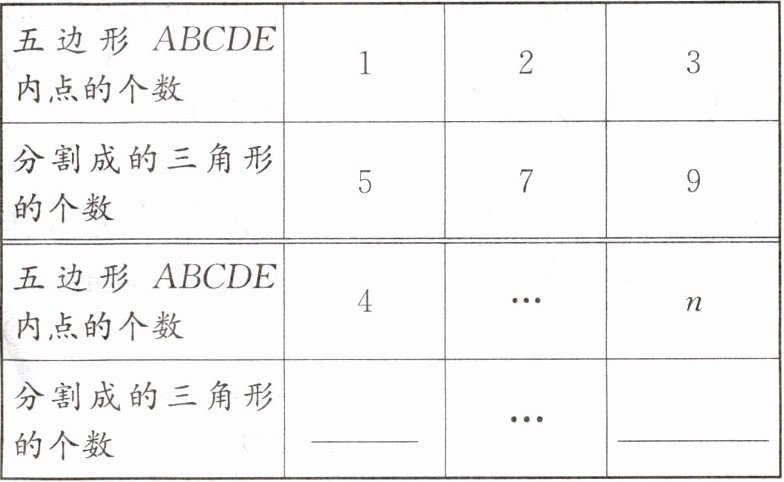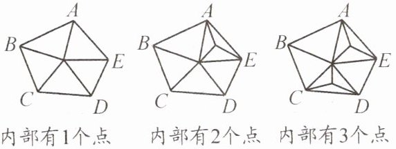 例2 【观察思考】如图,五边形$ABCDE$内部有若干个点,用这些点以及五边形$ABCDE的顶点A$、$B$、$C$、$D$、$E$把原五边形分割成一些三角形(互相不重叠).