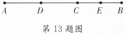 13. 如图,$ AB = 16 cm $,C是AB上的一点,且$ AC = 10 cm $,D是AC的中点,E是BC的中点,求线段DE的长.