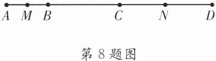 8. 如图,$ AB : BC : CD = 2 : 3 : 4 $,AB的中点M与CD的中点N之间的距离是$ 6 cm $,则$ BC = $