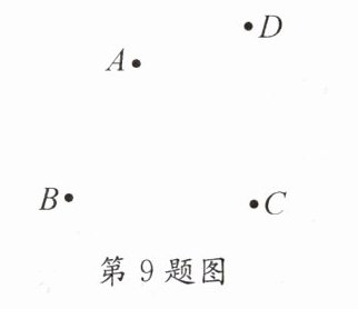 9. 如图,在一个居民楼区,有四栋楼A、B、C、D,现在要在它们之间修一个供居民休息的凉亭,应该修在何处,才能使四栋楼的居民到凉亭的距离之和最小?
