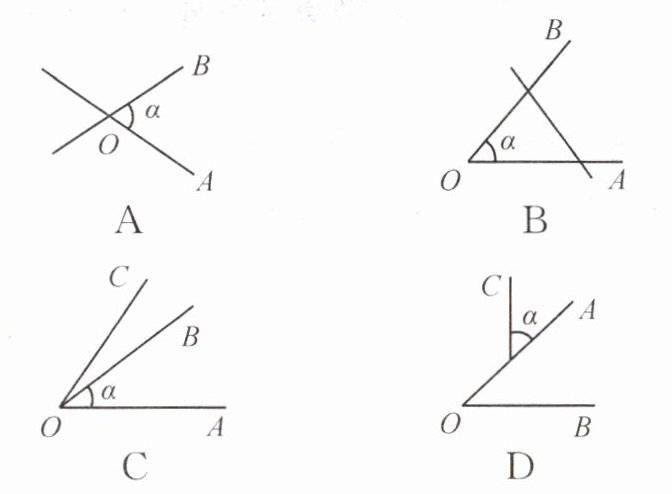 2. 下图所示四个图形中,能用∠α、∠AOB、∠O 三种方法表示同一个角的是 (