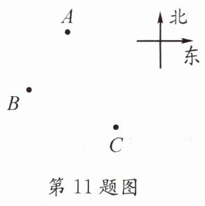 11. 如图,A、B、C 三个点分别代表邮局、医院、学校中的某一处,邮局和医院分别在学校的北偏西方向,邮局又在医院的北偏东方向,那么图中点 A 是
