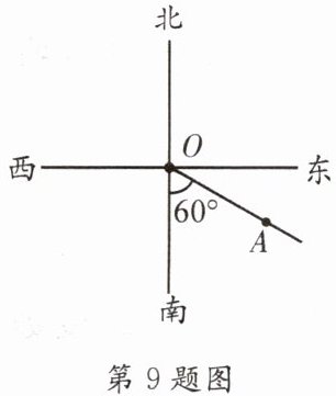 9. 如图,货轮 O 在航行过程中,发现灯塔 A 在它南偏东 60°的方向上,同时,在它北偏东 40°、南偏西 10°、西北(即北偏西 45°)方向上又分别发现了客轮 B、货轮 C 和海岛 D。仿照表示灯塔方位的方法画出表示客轮 B、货轮 C 和海岛 D 所在方向的射线。
