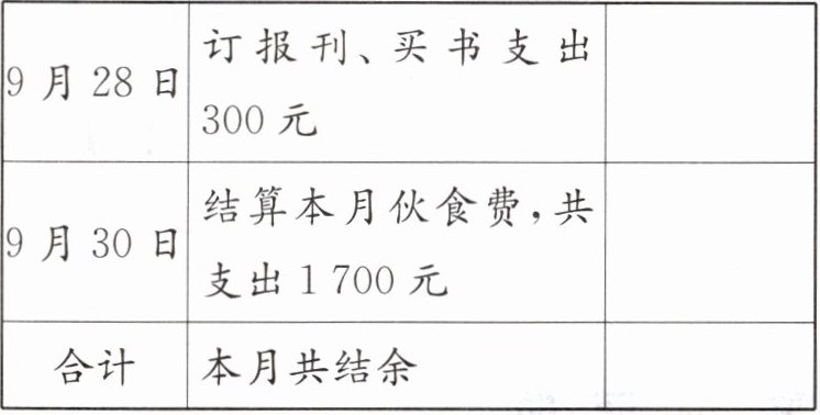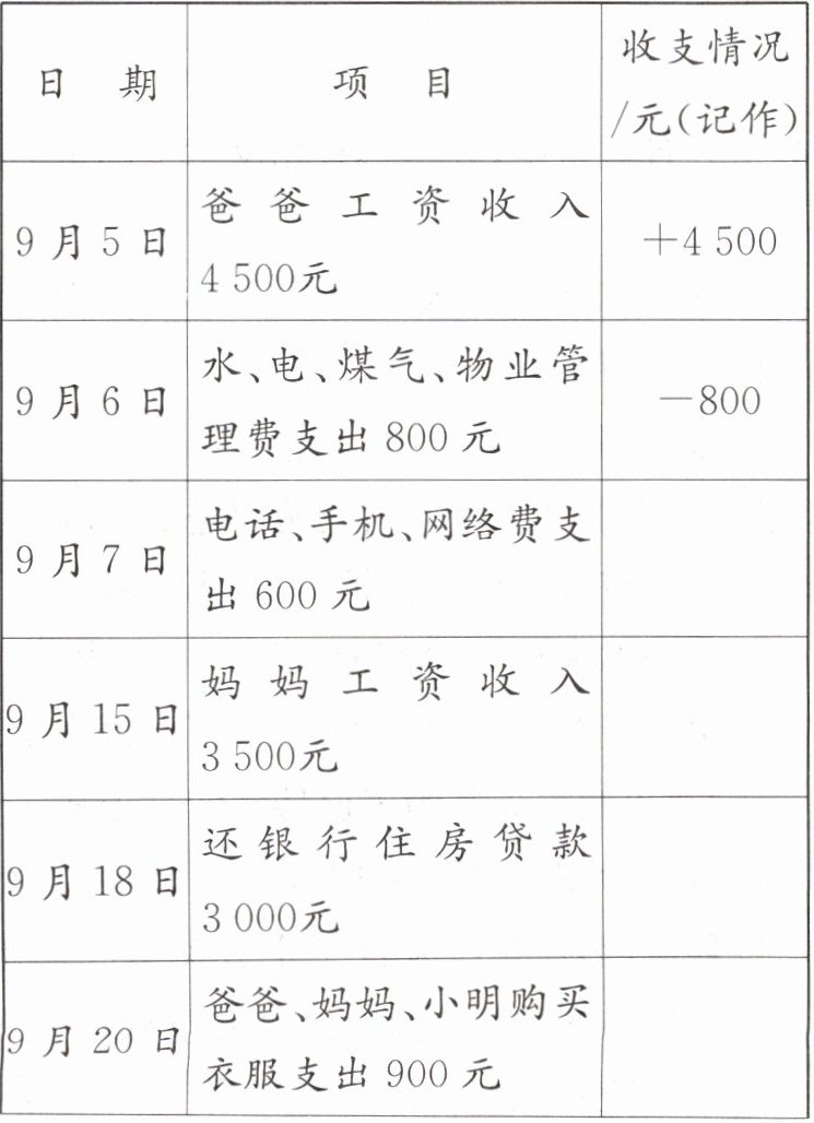 8. 小明希望“十一”黄金周出省旅游,大概花费3000元,爸爸和妈妈却拿出了家里9月份的收支记录表给他看,小明家9月份的收支情况记录如下表: