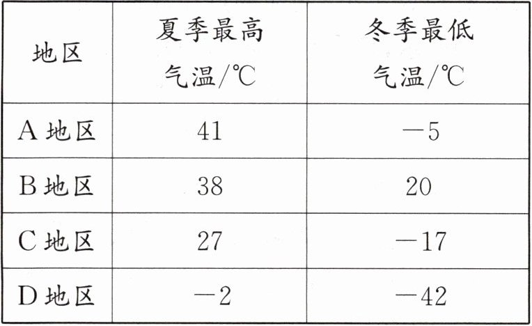 A 地区的四季温差是 41-(-5)=46(℃);B 地区的四季温差是 38-20=18(℃);C 地区的四季温差是 27-(-17)=44(℃);D 地区的四季温差是-2-(-42)=40(℃).