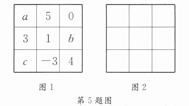 5. 如图 1,康康将$-3$,$-2$,$-1$,$0$,$1$,$2$,$3$,$4$,$5$分别填入九个空格内,使每行、每列、每条对角线上的三个数之和相等,其中$a$、$b$、$c$分别代表其中的一个数。