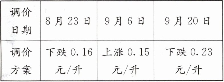 例3 国内油价调整机制规定,成品油调价周期为10个工作日。2024年8月9日,某地92号汽油的价格为8.40元/升,经三轮成品油调价(调价方案如表)后,92号汽油的价格为(