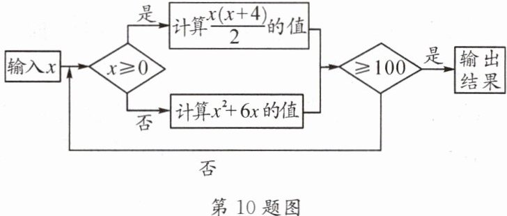 10. 按下图所示的程序计算,若开始输入的$x的值是- 2$,则最后输出的结果是 (
