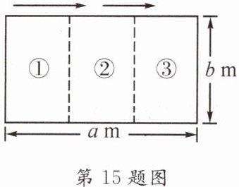15. 如图是一个长方形的铝合金窗框,其长为$a\ m$,宽为$b\ m$,其中装有同样大的$3$块塑钢玻璃. 当第②块向右拉到与第③块重叠$\frac{1}{2}$,再把第①块向右拉到与第②块重叠$\frac{1}{3}$时,用含$a与b$的式子表示这时窗户的通风面积是