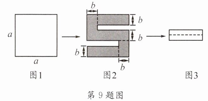 9. 如图 1,将一张边长为$a$的正方形纸片剪去两个小长方形,得到一个“ ”形图案,如图 2 所示,再将剪下的两个小长方形拼成一个新的长方形,如图 3 所示,则新长方形的周长可表示为(