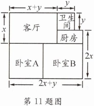 卧室是长为(2x+y)米、宽为[2x-(x-y)]=(x+y)米的长方形,因此卧室的面积为(2x+y)(x+y)=(2x²+3xy+y²)平方米.