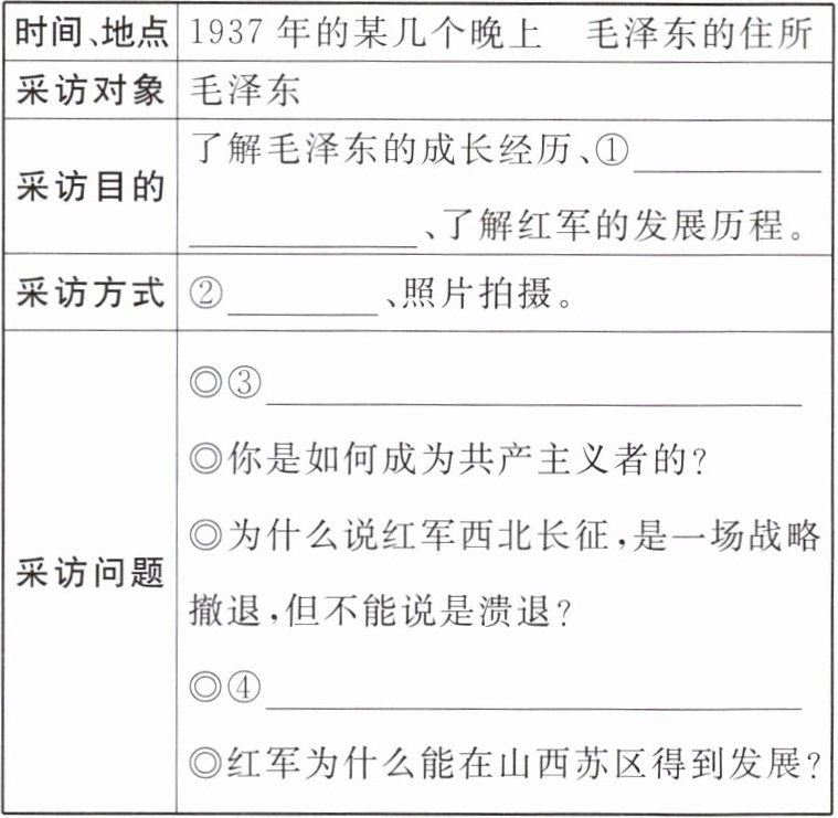 ①(示例)了解毛泽东成为共产主义者的经过 ②(示例)访谈 ③(示例)你幼年和青年时期的情形是怎样的? ④(示例)红军长征都经历了什么?