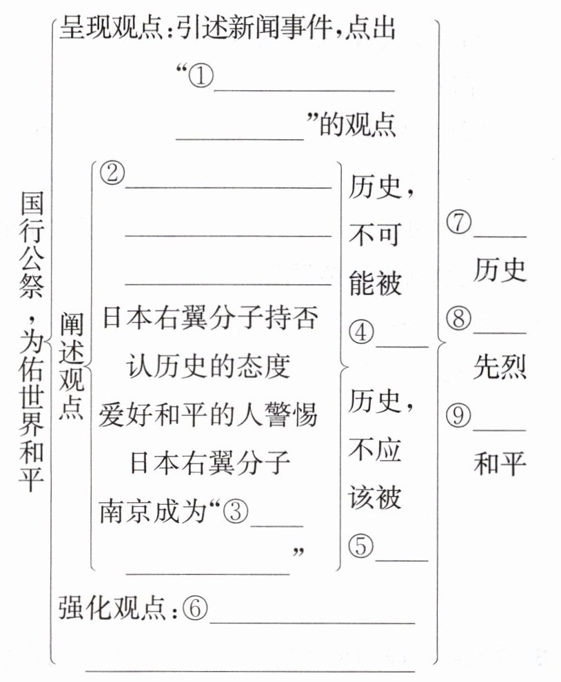①牢记历史,维护和平 ②全世界的正义之士以不同方式纪念死难者 ③国际和平城市 ④忘却 ⑤扭曲 ⑥中国将力促世界和平 ⑦铭记 ⑧缅怀 ⑨热爱