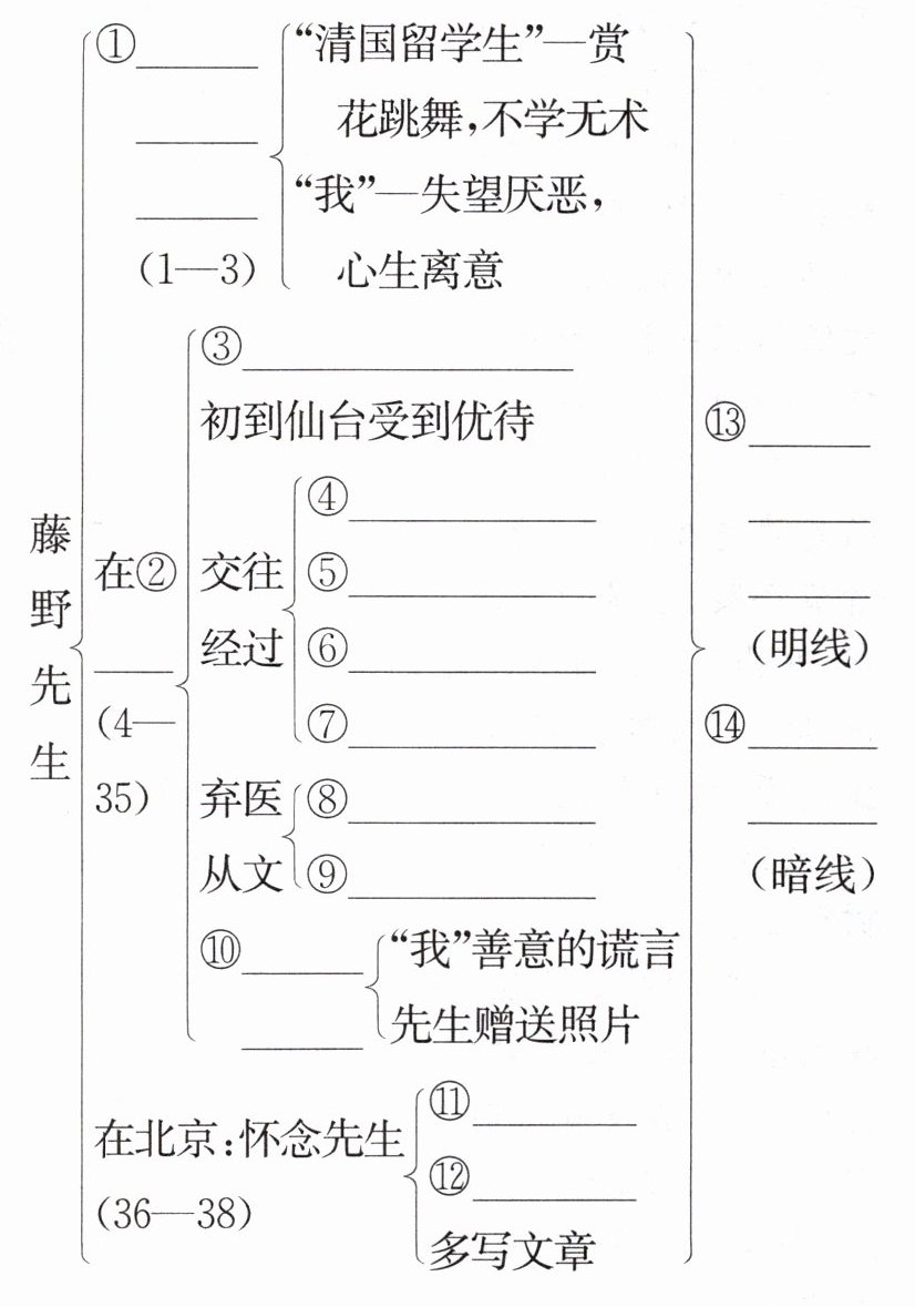 ①在东京的见闻与感受 ②仙台 ③去仙台路上的见闻 ④添改讲义 ⑤纠正解剖图 ⑥关心解剖实习 ⑦了解裹脚情形 ⑧匿名信事件 ⑨看电影事件 ⑩与先生惜别 ⑪收藏讲义 ⑫悬挂照片 ⑬与藤野先生的交往 ⑭爱国之情
