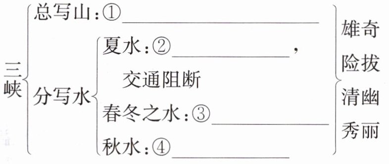 ①山高岭连,遮天蔽日 ②水涨湍急 ③清幽秀丽 ④肃杀凄清