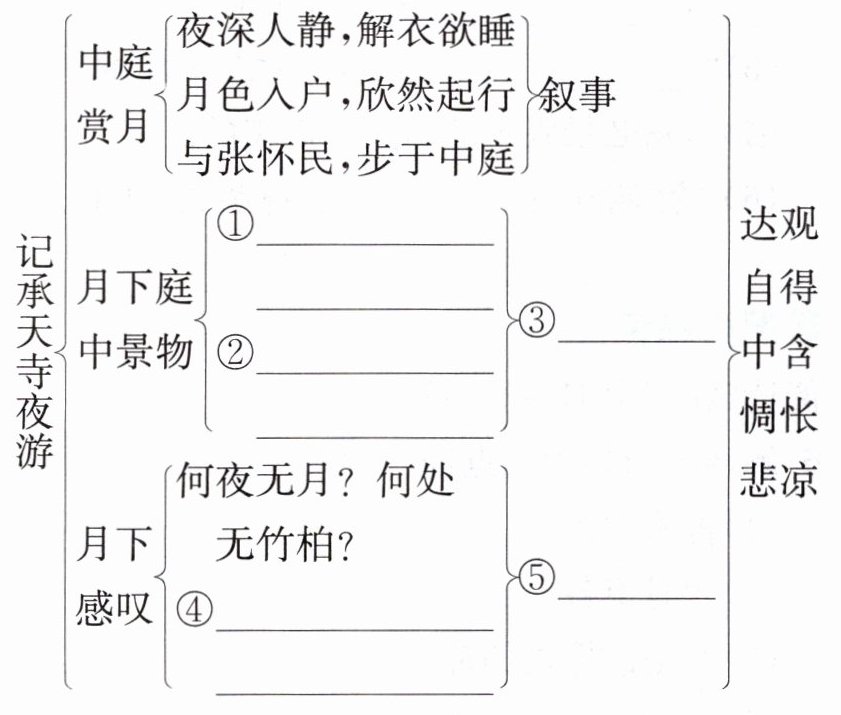 ①庭下如积水空明 ②藻、荇交横,盖竹柏影也 ③写景 ④但少闲人如吾两人者耳 ⑤抒情、议论