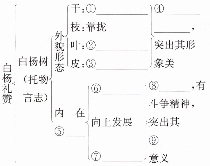 ①笔直 ②片片向上 ③光滑 ④旺盛,力争上游 ⑤品格 ⑥倔强挺立 ⑦不折不挠 ⑧坚强 ⑨象征
