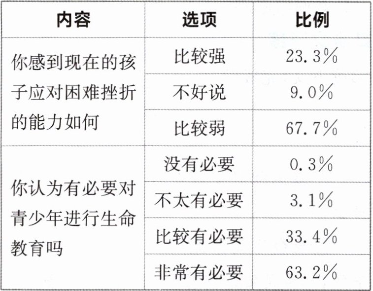 ①近七成的受访者认为现在的孩子应对困难挫折的能力比较弱;②超过六成的受访者认为非常有必要对青少年进行生命教育。
