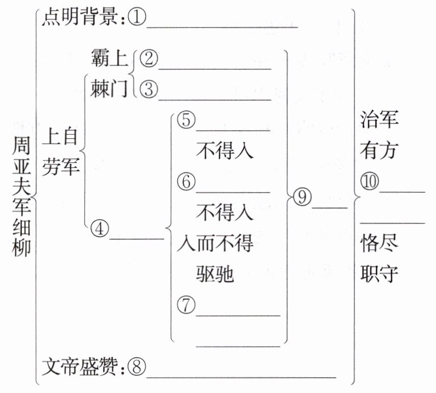 ①匈奴入侵,分兵驻守 ②直驰而入 ③将士送迎 ④细柳 ⑤先驱 ⑥上至 ⑦持兵器行军礼 ⑧周亚夫真将军 ⑨对比 ⑩刚正不阿