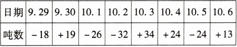 (3)9.29库存量为100-18=82(吨),9.30库存量为82+19=101(吨),10.1库存量为101-26=75(吨),10.2库存量为75-32=43(吨),10.3库存量为43+34=77(吨),10.4库存量为77+24=101(吨),10.5库存量为101-24=77(吨),10.6库存量为77+13=90(吨).这8天中库存量最大值为101吨,库存量最小值为43吨,所以101-43=58(吨).答:这8天中库存量最大值与库存量最小值的差是58吨.