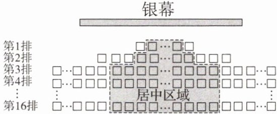 (2)图中的阴影区域为居中区域,第$1排的两侧各去掉1个座位后得到第1$排的居中区域,第$2排的居中区域比第1排的居中区域在两侧各多1$个座位,第$3$排及后面每排的居中区域座位数相等,都比第$2排的居中区域在两侧各多2$个座位. 居中区域的第$7$,$8$,$9$排为最佳观影位置.