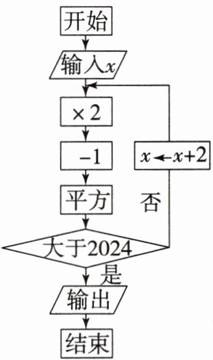 8. 如图是计算机程序的一个流程图,现定义:“$x\leftarrow x + 2$”表示用 $x + 2$ 的值作为 $x$ 的值输入程序再次计算. 比如:当输入 $x = 2$ 时,依次计算作为第一次“传输”,可得 $2×2 = 4$,$4 - 1 = 3$,$3^{2}= 9$,$9$ 不大于 $2024$,所以 $2 + 2 = 4$,把 $x = 4$ 输入程序,再次计算作为第二次“传输”,可得第二次“传输”,可得 $4×2 = 8$,$8 - 1 = 7$,…$$,若输入 $x = 1$,那么经过