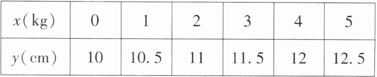 ①③④[提示:①x与y都是变量,且x是自变量,y是因变量,正确.②弹簧不挂重物时的长度为10cm,错误.③物体质量每增加1kg,弹簧长度增加0.5cm,正确.④所挂物体质量为7kg时,弹簧长度为13.5cm,正确.]