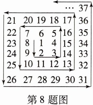 8. (2023·聊城中考)如图,图中数字是从$1$开始按箭头方向排列的有序数阵。从$3$开始,把位于同一列且在拐角处的两个数字提取出来组成有序数对:$(3,5)$,$(7,10)$,$(13,17)$,$(21,26)$,$(31,37)$,…,如果单独把每个数对中的第一个或第二个数字按顺序排列起来研究,就会发现其中的规律。请写出第$n$个数对:______。