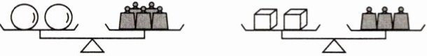 5[提示:设1个砝码、1个球和1个正方体的质量分别为a,b,c,根据题意,得2b=5a,2c=3a.将2b=5a等号两边同时除以2,得b=$\frac{5a}{2}$.再将b=$\frac{5a}{2}$等号两边同时乘3,得3b=$\frac{15a}{2}$①.将2c=3a等号两边同时乘5,得10c=15a,再将10c=15a等号两边同时除以2,得5c=$\frac{15a}{2}$②.根据①②,得3b=5c,所以3个球的质量等于5个正方体的质量.]