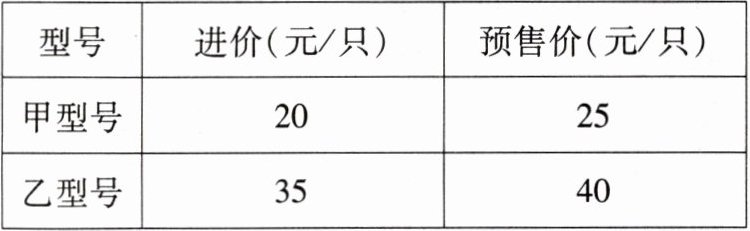 (2)300×(25-20)+400×(40-35)=1500+2000=3500(元).答:若按预售价将甲、乙两种型号的节能灯全部售完,该超市可获得3500元的利润.