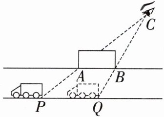 17. $20世纪90$年代以来,我国户外广告行业取得了突飞猛进的发展,户外广告装置多设立于城市道路、铁路、公路等主要交通干道边上,面向密集的车流和人流。某天,小芳走到如图所示的$C$处时,看到正对面一条东西走向的笔直公路上有一辆汽车从东面驶来,到达$Q$处时,恰好被公路北侧边上竖着的一个长$12\ m的广告牌AB$完全挡住,$3\ s后在P$处又重新看到该汽车的全部车身。已知该汽车的行驶速度是$21.6\ km/h$,假设$AB // PQ$,公路宽为$10\ m$,求小芳所在$C处到公路南侧PQ$的距离。