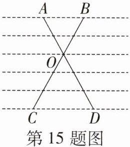 15. 如图,顽皮的小聪在小芳的作业本上用红笔画了个“$×$”(作业本中的横格线都平行,且相邻两条横格线间的距离都相等),$A$,$B$,$C$,$D$,$O$都在横格线上,且线段$AD$,$BC交于点O$。若线段$AB = 4\ cm$,则线段$CD$的长为(
