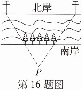 16. 如图,一条河的两岸有一段是平行的,在河的南岸边每隔$5$米有一棵树,在北岸边每隔$50$米有一根电线杆,小丽站在离南岸边$15米的点P$处看北岸,发现北岸相邻的两根电线杆恰好被南岸的两棵树遮住,并且在这两棵树之间还有三棵树,则河宽为______。