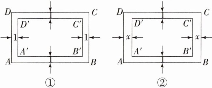 (1) 如图①,若沿矩形ABCD四周有宽为1的环形区域,图中所形成的两个矩形ABCD与A'B'C'D'相似吗?请说明理由.