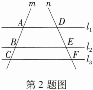 2. 如图,直线 $ l_1 // l_2 // l_3 $,分别交直线 $ m $,$ n $ 于点 $ A $,$ B $,$ C $ 和点 $ D $,$ E $,$ F $。若 $ AB:BC = 5:3 $,$ DE = 15 $,则 $ DF $ 的长为(
