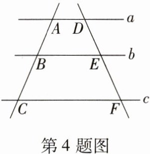 4. 如图,直线 $ a // b // c $,$ AB = \frac{4}{5}BC $,若 $ DF = 9 $,则 $ EF $ 的长度为(