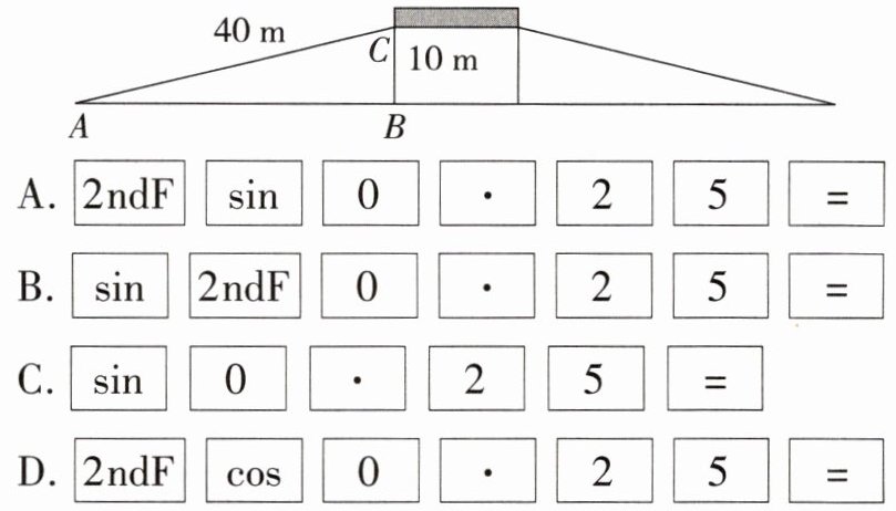 15. 如图,为方便行人推车过天桥,某市政府在$10\ m高的天桥两端分别修建了40\ m$长的斜道,用科学计算器计算这条斜道的倾斜角$\angle A$,下列按键顺序正确的是(