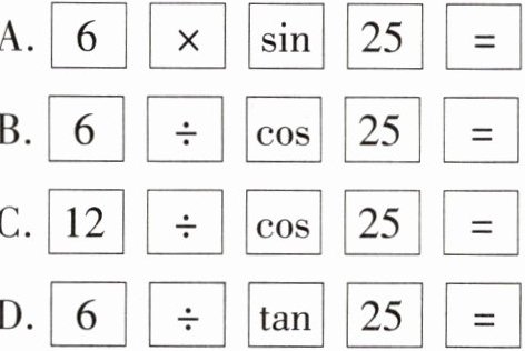 14. 如图,一座厂房屋顶人字架的跨度$AC= 12\ m$,上弦$AB= BC$,$\angle BAC= 25^{\circ }$.若用科学计算器求上弦$AB$的长,则下列按键顺序正确的是(