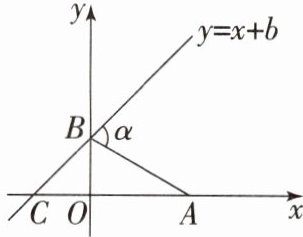 9. 如图,已知点 $ A(5 \sqrt{3},0) $,直线 $ y = x + b(b > 0) $ 与 $ x $ 轴、$ y $ 轴分别交于点 $ C $、点 $ B $,连接 $ AB $,$ \alpha = 75^{\circ} $,求 $ b $ 的值。