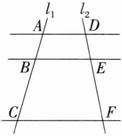 16. 如图,已知 $ AD // BE // CF $,它们依次交直线 $ l_1 $,$ l_2 $ 于点 $ A $,$ B $,$ C $ 和点 $ D $,$ E $,$ F $,$ \frac{DE}{EF} = \frac{2}{5} $,$ AC = 14 $。