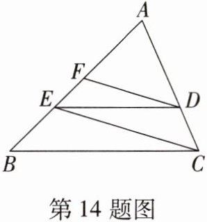 14. 如图,在 $ \triangle ABC $ 中,点 $ D $ 为 $ AC $ 上一点,且 $ \frac{CD}{AD} = \frac{1}{2} $,过点 $ D $ 作 $ DE // BC $ 交 $ AB $ 于点 $ E $,连接 $ CE $,过点 $ D $ 作 $ DF // CE $ 交 $ AB $ 于点 $ F $。若 $ AB = 15 $,则 $ EF = $