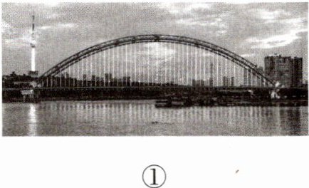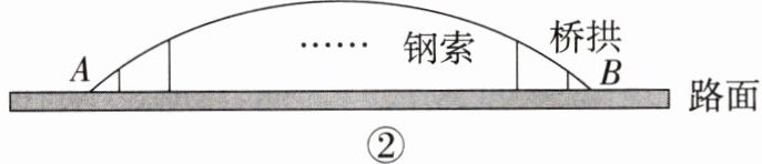 11. (2023·威海期中)如图①,武汉晴川桥可以近似地看作半径为$250\ m$的圆弧(示意图如图②),桥拱和路面之间用数根钢索垂直相连,其正下方的路面$AB长300\ m$,那么这些钢索中最长的一根长