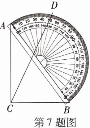 7. 如图,一块直角三角板 $ABC$ 的斜边 $AB$ 与量角器的直径重合,点 $D$ 对应的刻度值为 $50^{\circ}$,则 $\angle BCD$ 的度数为