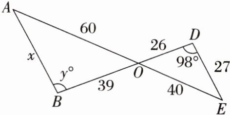 解:$\because\frac{OD}{OB}=\frac{26}{39}=\frac{2}{3}$,$\frac{OE}{OA}=\frac{40}{60}=\frac{2}{3}$,$\therefore\frac{OD}{OB}=\frac{OE}{OA}$.$\because\angle AOB=\angle EOD$,$\therefore\triangle AOB\backsim\triangle EOD$,$\therefore\frac{DE}{AB}=\frac{2}{3}$,即$\frac{27}{x}=\frac{2}{3}$,解得$x=\frac{81}{2}$,$\angle ABO=\angle EDO=98°$,即$y=98$.