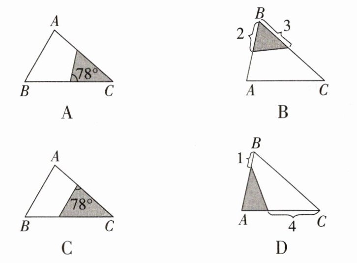 2. 已知在△ABC中,∠A= 78°,AB= 4,AC= 6,下列阴影部分的三角形与原△ABC不相似的是(