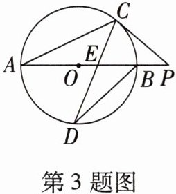 3. 如图,AB为⊙O的直径,延长AB到点P,过点P作⊙O的切线,切点为C,连接AC,∠P= 40°,D为圆上一点,连接DC,DB,则∠D的度数为(