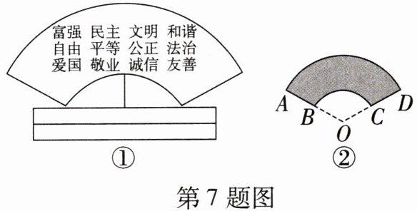 7. 如图①是一块弘扬“社会主义核心价值观”的扇面宣传展板,该展板的部分示意图如图②,它是以$O$为圆心,$OA$,$OB$长分别为半径,圆心角$\angle O = 120°$形成的扇面,若$OA = 4m$,$OB = 2m$,则阴影部分的面积是(