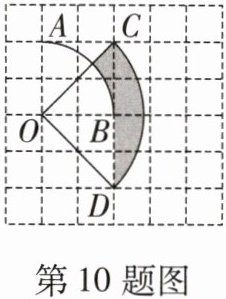 10. 如图,边长为1的正方形网格中,$O$,$A$,$B$,$C$,$D$是网格线的交点,若$\overset{\frown}{AB}与\overset{\frown}{CD}所在圆的圆心都为点O$,则阴影部分的面积为(