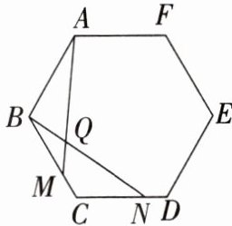 14. 如图,在正六边形ABCDEF中,M,N分别是边BC,CD上的点,且CM = DN,AM与BN交于点Q.