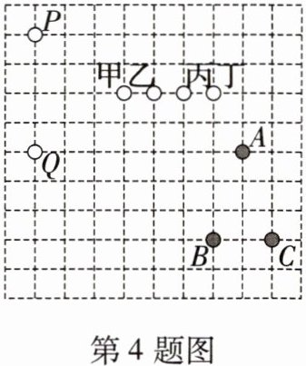 4. 如图,棋盘上有$A$,$B$,$C三个黑子与P$,$Q$两个白子. 若要使得$\triangle ABC\backsim\triangle RPQ$,第三个白子$R$应放在(